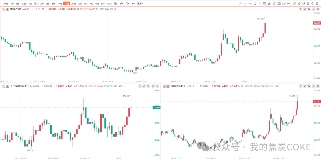 今日橡胶期货强势上涨,其中,橡胶、20号胶主力合约涨超3%,丁二烯橡胶主力合约涨超1%。